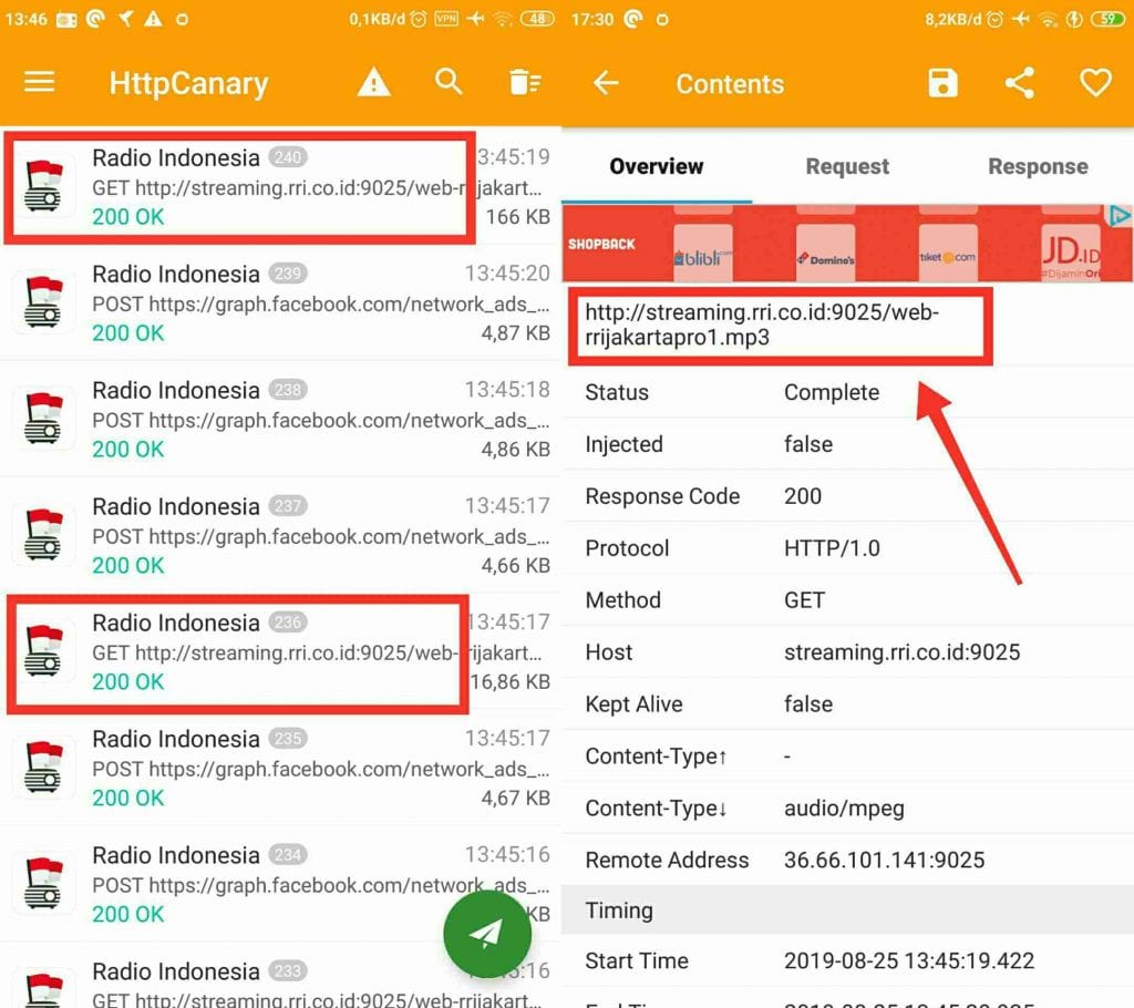 Dan langkah akhir kamu buka kembali aplikasi HttpCanary dan lihat list URL yang muncul di sana, cari URL yang kira-kira menjadi sumber streaming dari radio RRI Pro 1 Jakarta. Untuk lebih jelasnya bisa kamu lihat gambar di atas.