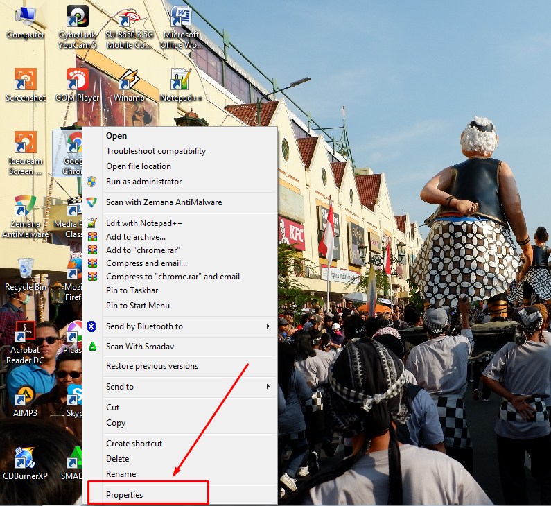 1. Klik kanan pada icon Google Chrome, lalu pilih Properties.