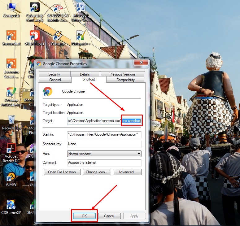 2. Pada menu Shortcut kolom Target, setelah tanda petik dan spasi tambahkan kode -no-sandbox. Kemudian klik Ok.