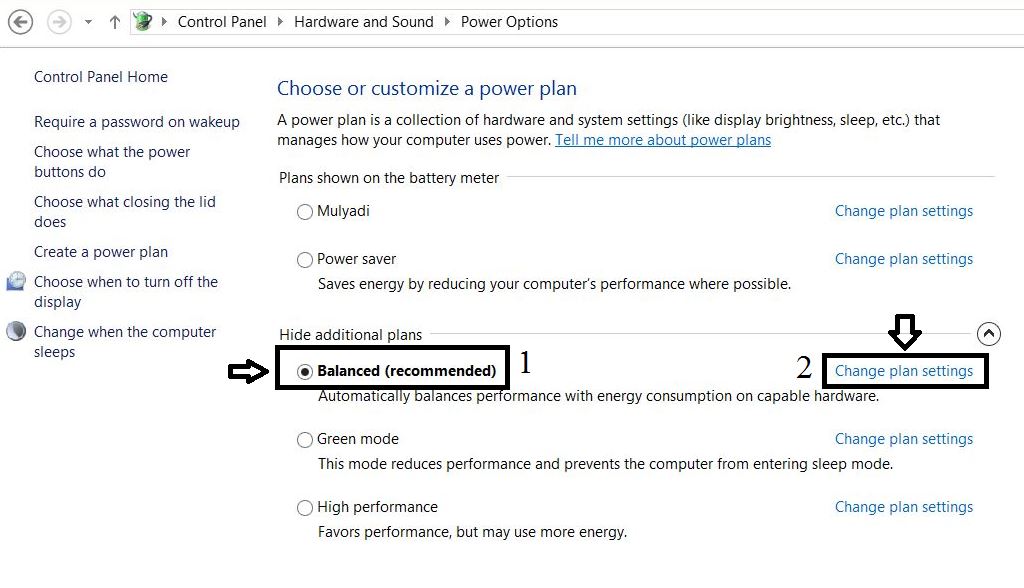 6. Kemudian langkah berikutnya, silahkan kamu beri tanda centang pada menu Balanced dan kemudian kamu pilih Change Plan Settings.