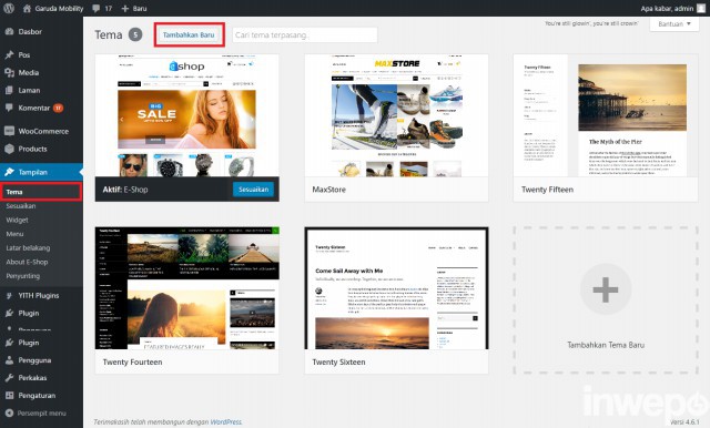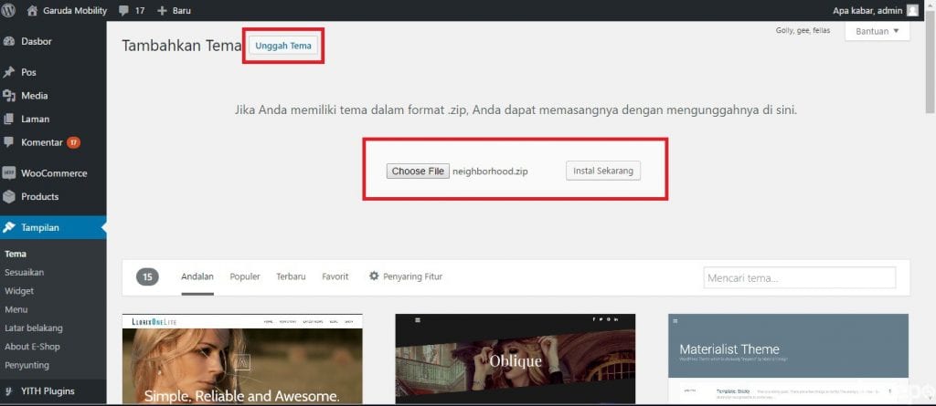 2. Buka browser lalu masuk ke halaman Admin projek WordPress Anda. Misalnya: http://localhost/garudamobility/wp-admin/. Kemudian pilih Tampilan – Tema – Tambahkan Baru.