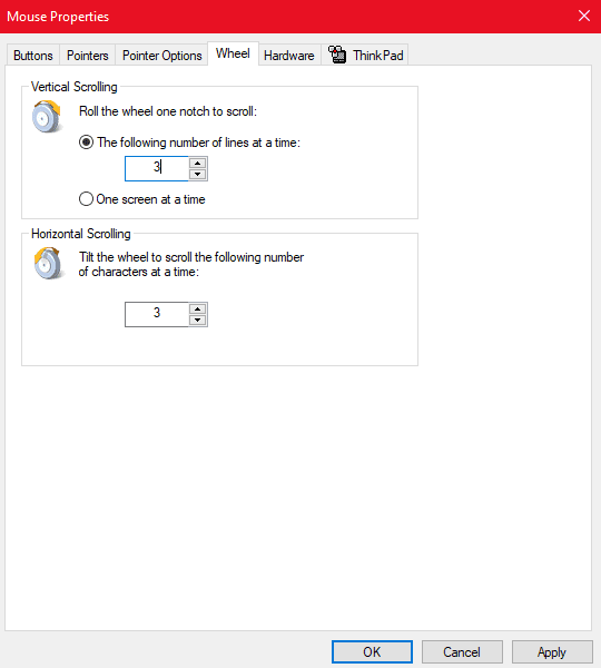 5. Pindah ke tab Wheel, lalu perhatikan Vertical Scrolling dan Horizontal Scrolling. Isi kedua nilai yang ada pada 2 opsi tersebut dengan angka 3. Apply dan tekan tombol Ok untuk menyimpan perubahan yang ada.