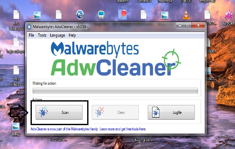 2. klik scan pada aplikasi AdwCleaner tersebut.