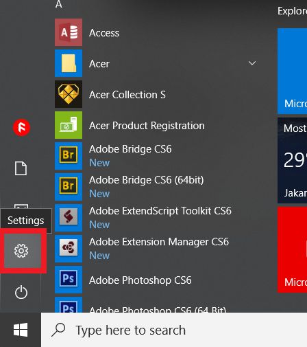 1. Kamu masuk ke pengaturan dengan cara klik pada tombol start menu lalu klik pada tombol berbentuk gerigi (Settings).