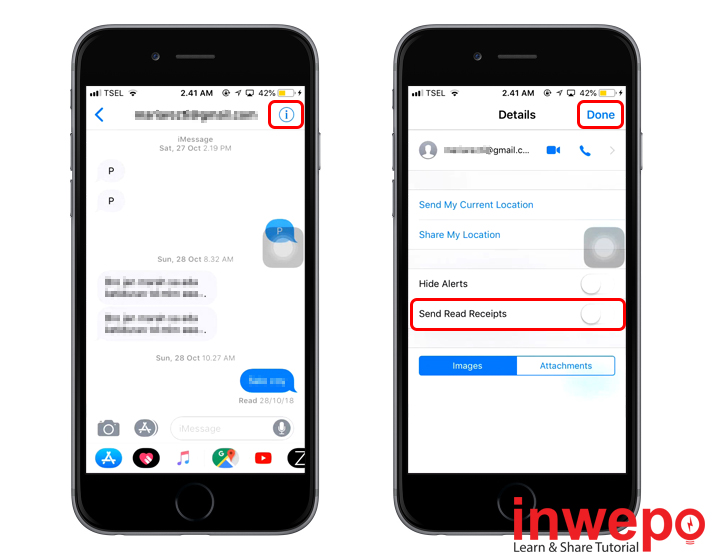 2. Ketuk ikon i di bagian kanan atas – Nonaktifkan knob hijau jika tidak ingin informasi bahwa pesan kamu sudah dibaca tersebut tampil – Ketuk Done.