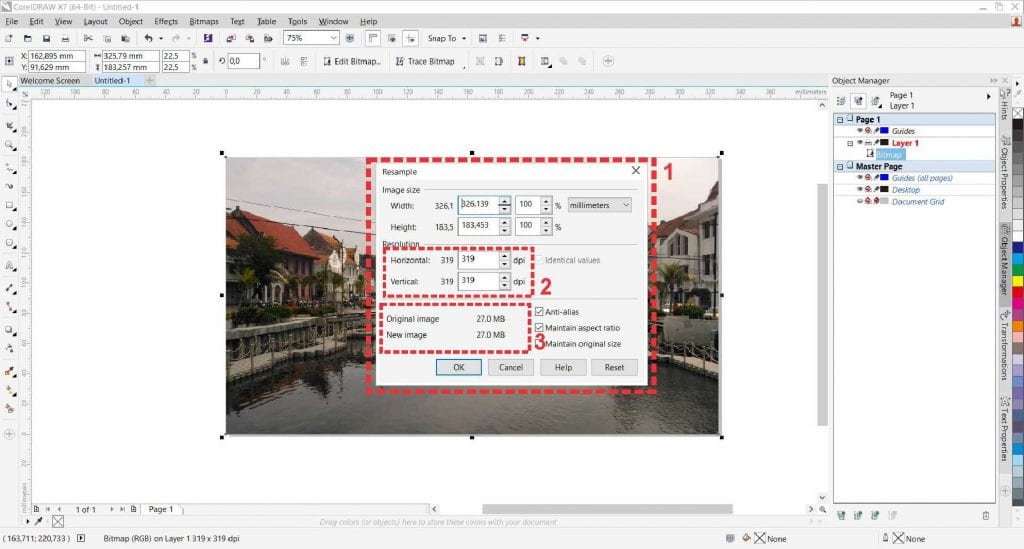 4. Kemudian akan muncul menu kotak dialog resample bitmap. Pada kotak dialog tersebut terdapat sub menu untuk mengatur resolusi (sebelum diubah, resolusi pada gambar foto tersebut berada pada 300 dpi dengan ukuran file 27 MB).