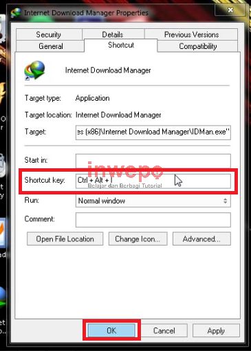 3. Lalu kamu klik pada bagian shortcut key dan pada keyboard PC kamu, kamu tekan apapun untuk menjadikannya sebagai shortcut key misalnya seperti Ctrl + Alt + I, jika sudah kamu klik OK.