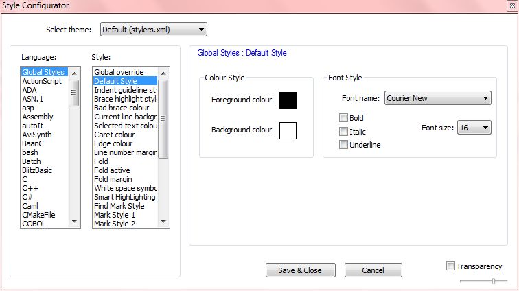 3. Pilihlah Default Style pada opsi Style agar pengaturan ukuran teks dapat diterapkan semua bahasa pemrograman. Kemudian, pilihlah ukuran teks editor pada opsi Font Size yang terdapat pada tab Font Style yang sesuai keinginan kamu atau sampai kamu nyaman dengan tampilan ukuran teks yang ditampilkan teks editor tersebut. Kemudian, Klik Save & Close.