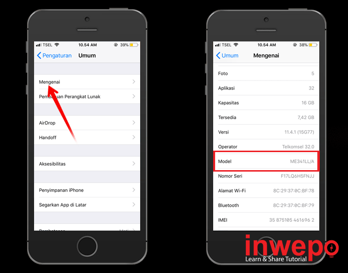 2. Ketuk Mengenai – Cari tulisan Model – Baca pengidentifikasi model, akan terlihat seperti “ME341LL/A”, huruf pertama akan memberi tahu kamu apakah iPhone tersebut Original, Refurbished atau Replacement Unit: