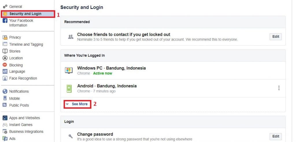 3. Lalu klik pada menu tab Security and login dan disana akan muncul beberapa device yang pernah kamu gunakan untuk masuk ke akun facebook kamu yang saat ini kamu pakai, klik pada tombol See more.