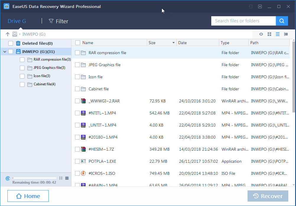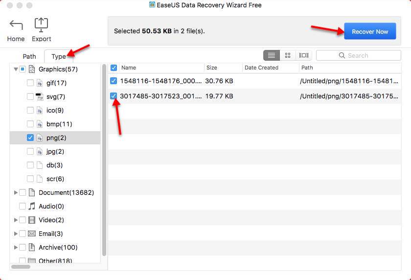 3. Jika hasil scan sudah selesai akan menampilkan semua data file yang dapat di kembalikan. Pilih Type untuk memudahkan kamu mencari format file. Lalu centang file yang ingin di kembalikan dan pilih Recovery Now.