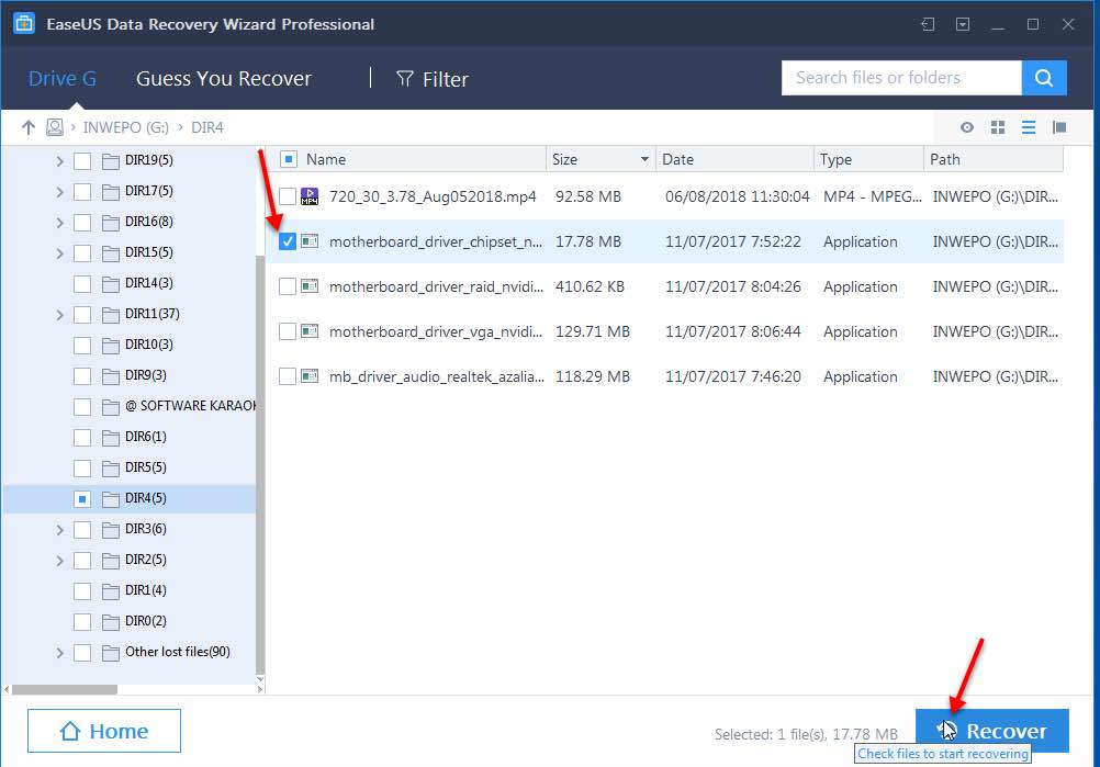5. Jika sudah ketemu file yang kamu ingin kembalikan (recovery), centang file – Pilih Recover.