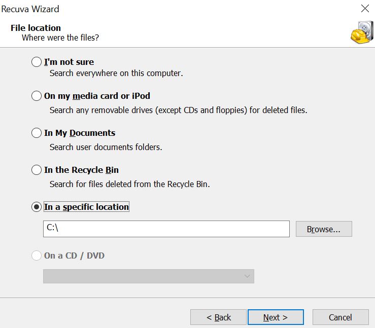 4. Klik kanan pada folder yang tadi telah ter-replace, lalu pilih Scan for deleted files. Jika tidak menemukan opsi ini, segera buka aplikasi Recuva yang tadi telah kamu install. Di bagian File Location, pilih opsi In a specific location, klik browser dan cari alamat folder yang ter-replace tadi. Klik next.