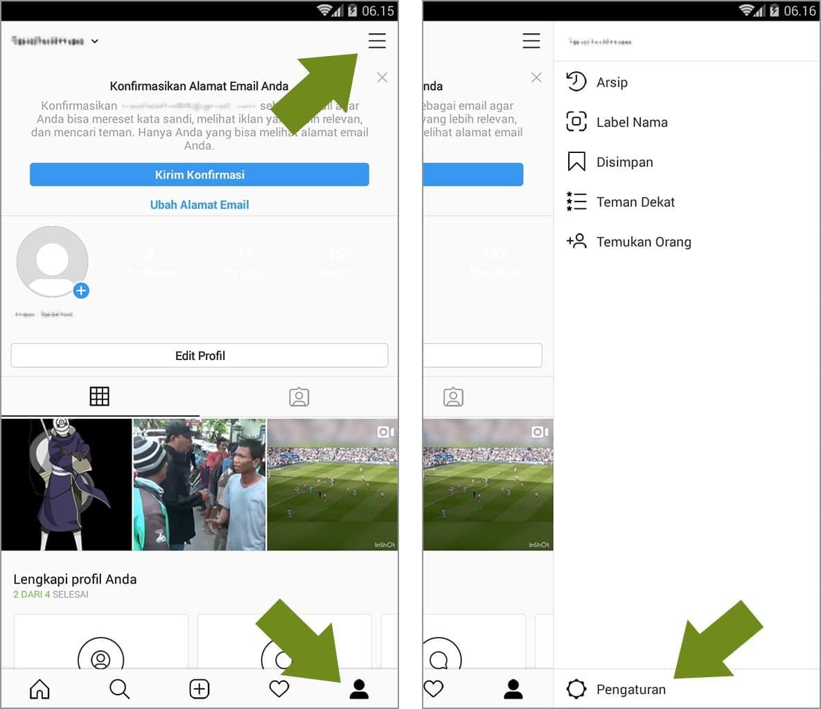 2. Ketuk ikon profil, kemudian tiga garis horizontal dan pilih pengaturan.