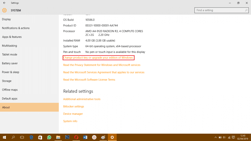 3. Klik About – Pilihlah “Change product key or upgrade your edition of Windows“.
