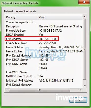 3. Catat alamat IP kalian, yaitu di IPv4 (Internet Protocol versi 4), sebagai contoh seperti pada gambar, yaitu: 192.168.1.1