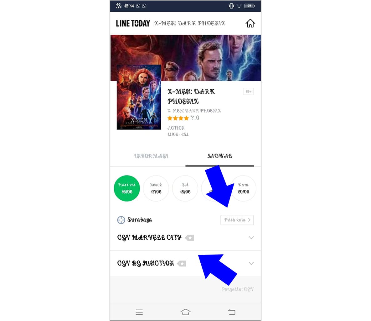 4. Sekarang untuk melihat jadwal film yang ingin kamu tonton, silakan ketuk nama filmnya, kemudian pilih jadwal.