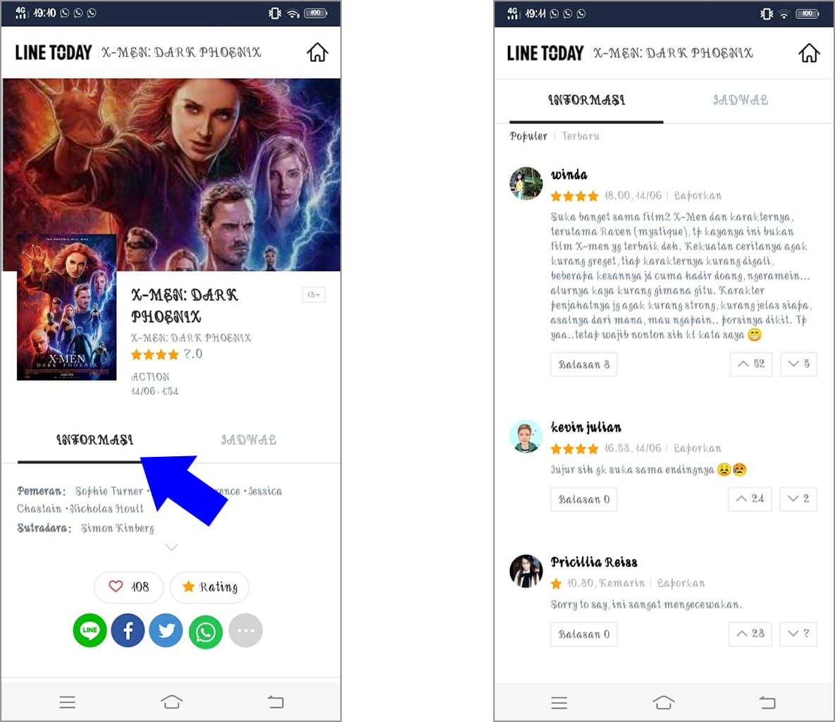 6. Sebelum memutuskan menonton film A atau film B, pastikan kamu sudah melihat rating dan komentar orang-orang yang sudah menontonnya sehingga bisa kamu jadikan referensi. Untuk mengetahuinya cukup gulir ke bawah pada bagian informasi.