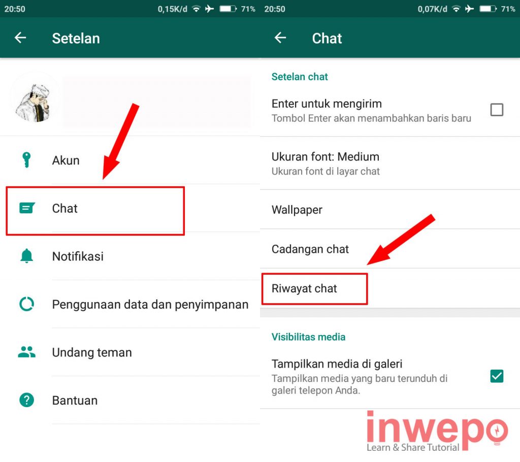 2. Langkah kedua, berikutnya pada menu Setelan pilih menu Chat kemudian pilih lagi menu Riwayat Chat.