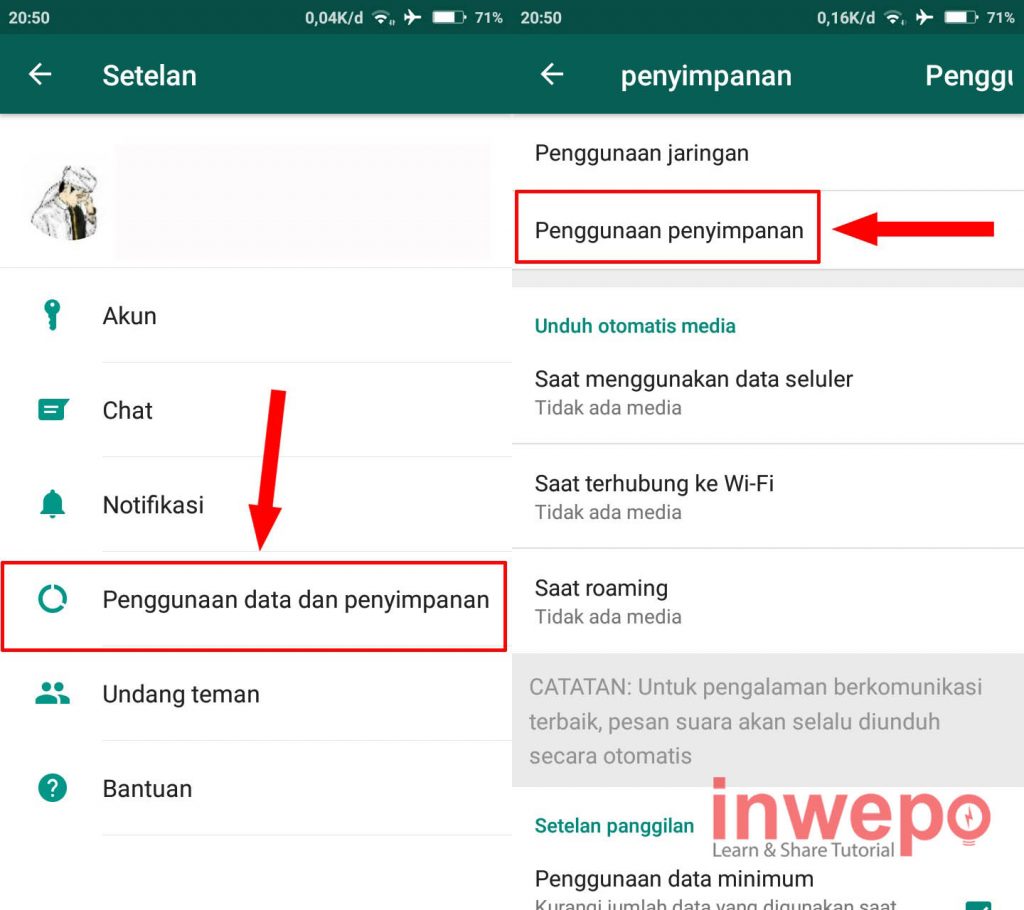 1. Langkah pertama, masih sama dengan cara pertama langsung masuk ke menu Setelan selanjutnya pilih menu Penggunaan data dan penyimpanan. Berikutnya pilih Penggunaan penyimpanan.
