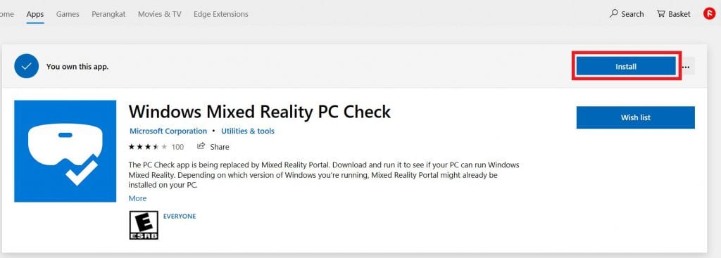 2. Lalu kamu cari aplikasi bernama Windows Mixed Reality PC Check dan kamu install aplikasi tersebut.
