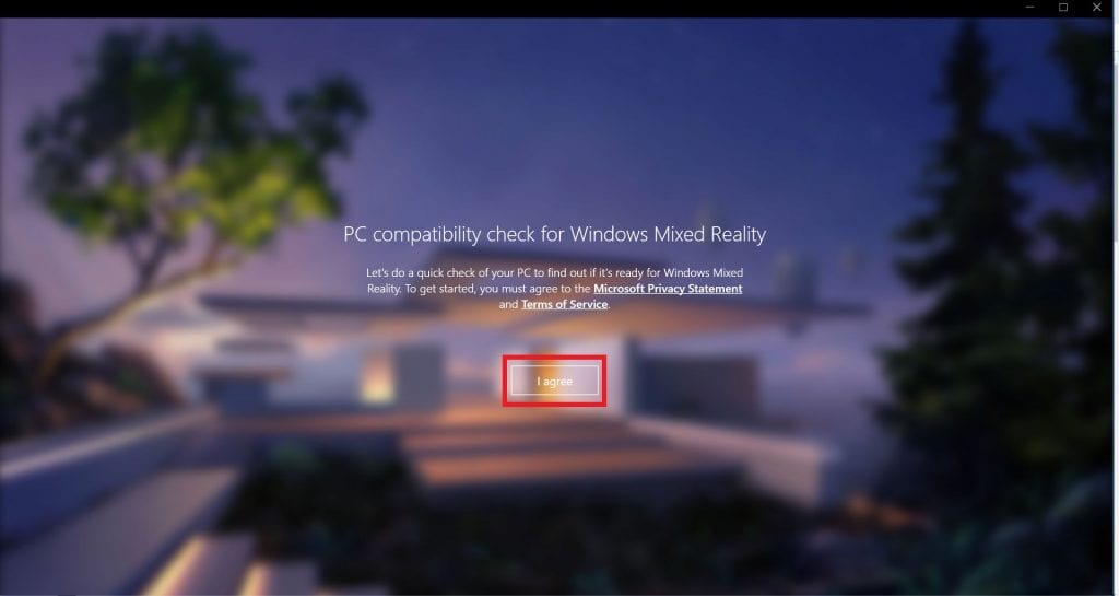 4. Jika aplikasi Windows Mixed Reality PC Check sudah terbuka, kamu akan melihat tampilan seperti di bawah ini, kamu klik pada tombol I Agrree.
