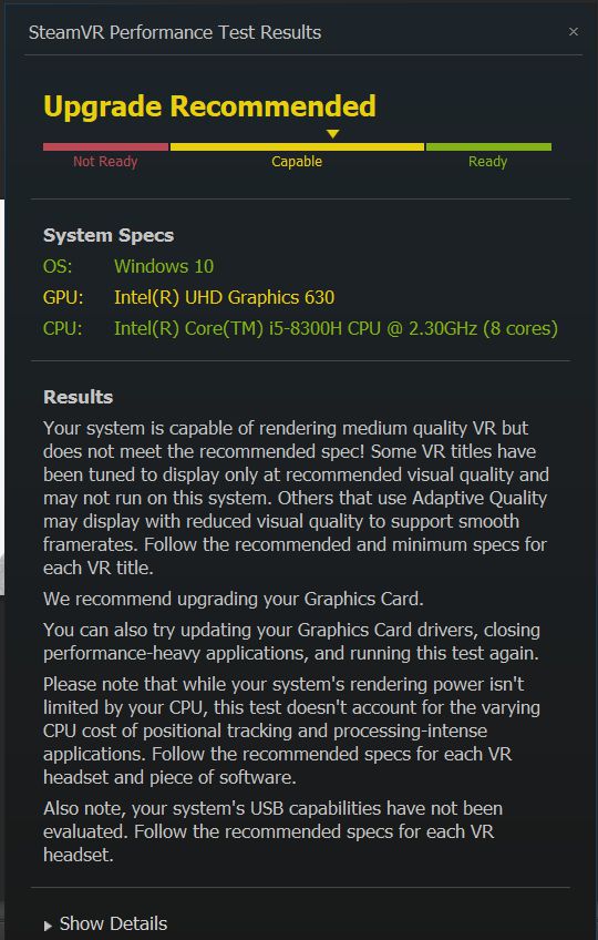 Jika hasil yang kamu dapatkan adalah Capable, maka laptop kamu sudah mendukung dan bisa bermain game Virtual Reality tetapi dalam proses rendering game kamu hanya akan mendapatkan kualitas grafik yang di bawah standar, dan biasanya akan disarankan pula untuk mengganti perangkat keras yang pada System Specs-nya berwarna kuning.