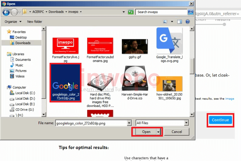 4. Cari gambar yang tadi kamu siapkan dan klik open lalu klik tombol continue.