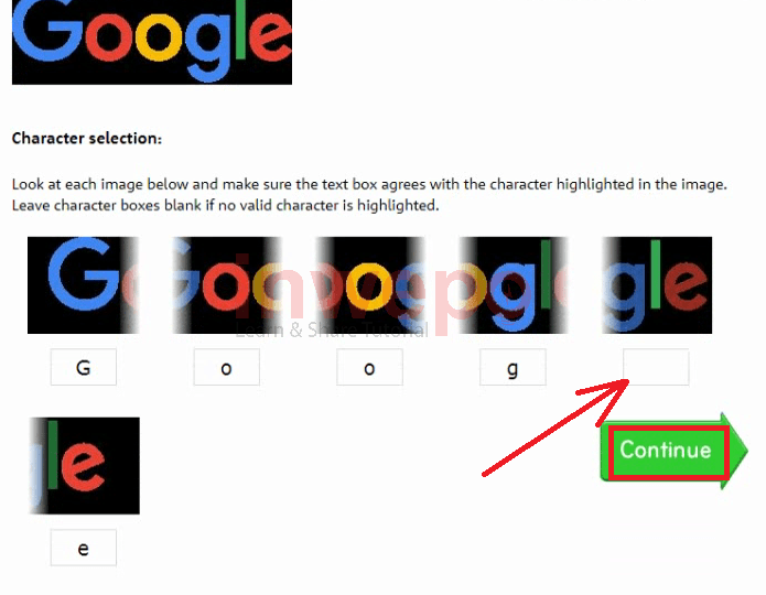 5. Disini kamu akan ditanya apa huruf pada bagian yang ditandai, seperti pada gambar dibawah ini, untuk huruf l tidak terdeteksi oleh situs, sehingga kamu harus memasukannya secara manual, lalu klik tombol continue.