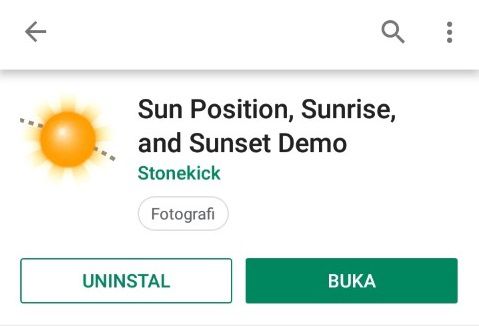 1. Kamu unduh terlebih dahulu aplikasi Sun Position, Sunrise and Sunset Demo di Playstore bagi pengguna Android, bagi pengguna iOS kamu bisa mencarinya di Apps Store dengan kata kunci yang sama atau bisa menggunakan kata kunci sun position tracker.
