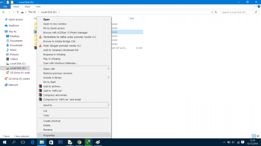 2. Pilihlah file atau folder yang kamu ingin cek ukuran file-nya dengan klik kanan pada Mouse. Pilih Properties.