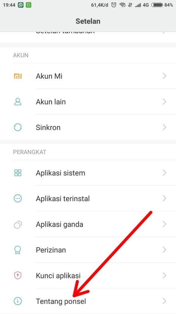 2. Selanjutnya di dalam menu “Setelan” gulir ke bawah sampai kamu menemukan opsi “Tentang ponsel”. Sentuh opsi tersebut.