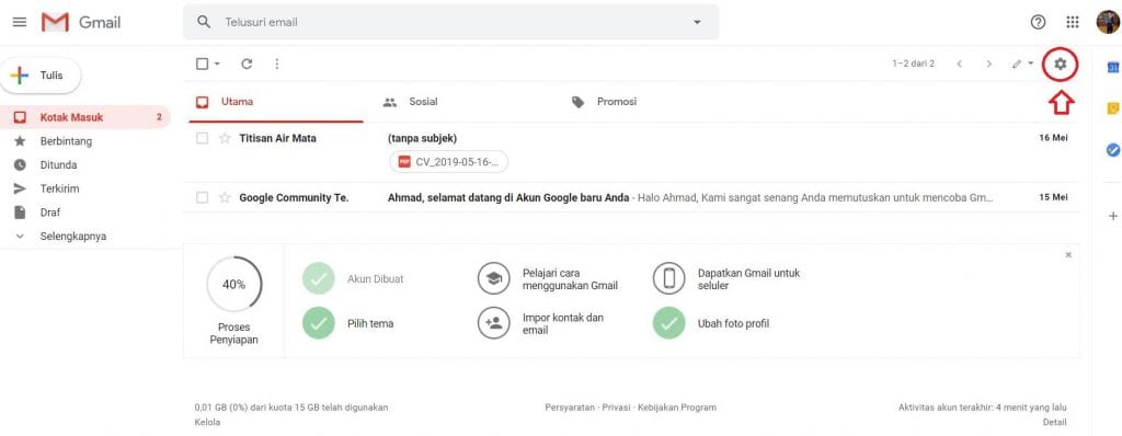 3. Ini adalah tampilan utama dari Gmail, setelah kamu masuk login. Terlihat dari tampilan background tema nya masih putih polos dan sederhana. Lalu bagaimana cara mengganti background tersebut? silahkan kamu masuk ke dalam pengaturan gmail – kemudian pilih tema.