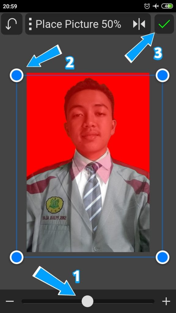 6. Otomatis kita dialihkan di Place Picture, maka langsung saja pertama kita atur contrast di bawah dengan 50% selanjutnya kita cocok kan agar bagian kepala pas, jika sudah rapih. Langsung saja kamu ceklis.