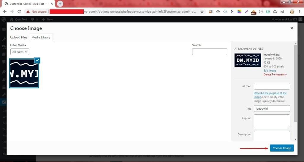 10. Pilihlah gambar yang tersedia di Wordpress dengan klik tab Media Library atau bisa upload gambar terlebih dahulu bagi yang belum memiliki gambar logo di dalam Wordpress. Kamu juga bisa mengambil gambar logo secara eksternal yakni menyalin link situs website lain yang berisi gambar. Setelah itu, klik Choose Image.