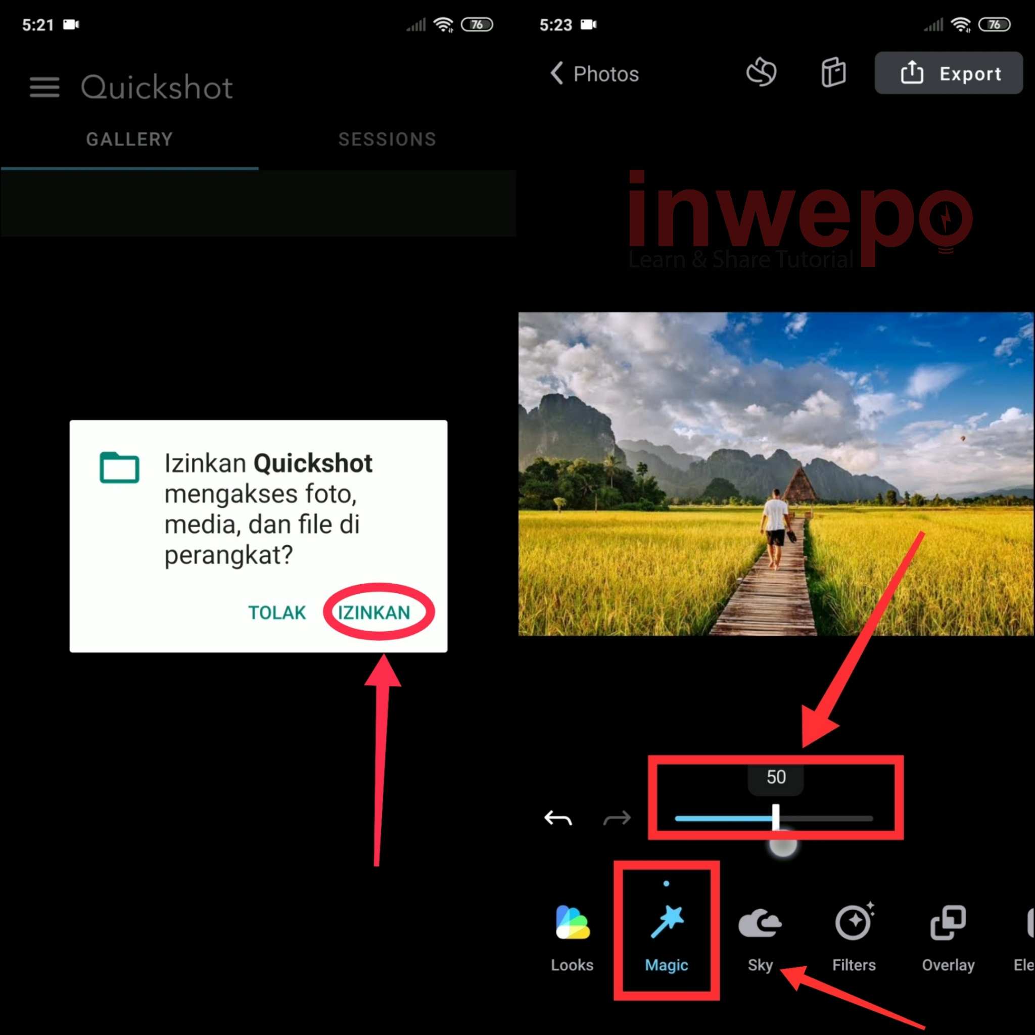 3. Langkah ketiga, beri izin akses pada aplikasi dengan tap menu Izinkan. Tap menu Magic lalu geser slider untuk mengatur ketajaman gambar maupun photo. Langsung tap menu Sky untuk mulai mengganti bentuk langit.