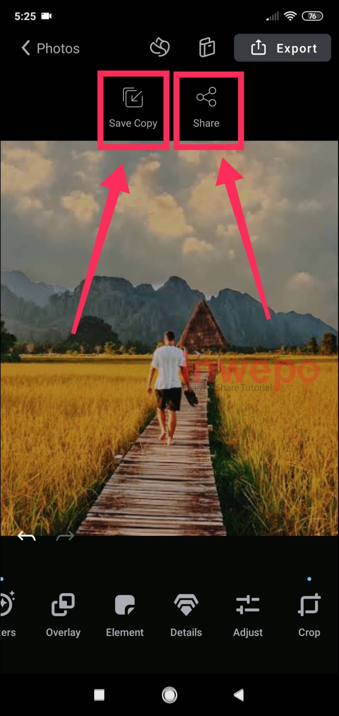 5. Langkah kelima, tap menu Export yang berada di bagian atas. Lalu pilih Save copy untuk menyimpan foto ke galeri smartphone. Atau bisa juga dengan tap menu Share jika ingin langsung membagikannya ke jejaring media sosial yang kamu miliki.