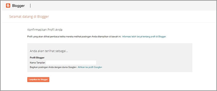 4. Akan muncul nama tampilan. Silakan kamu isi sesuai dengan nama yang kamu inginkan – lanjutkan ke Blogger.