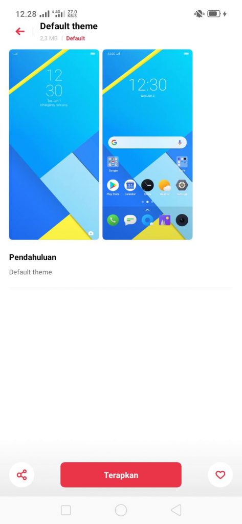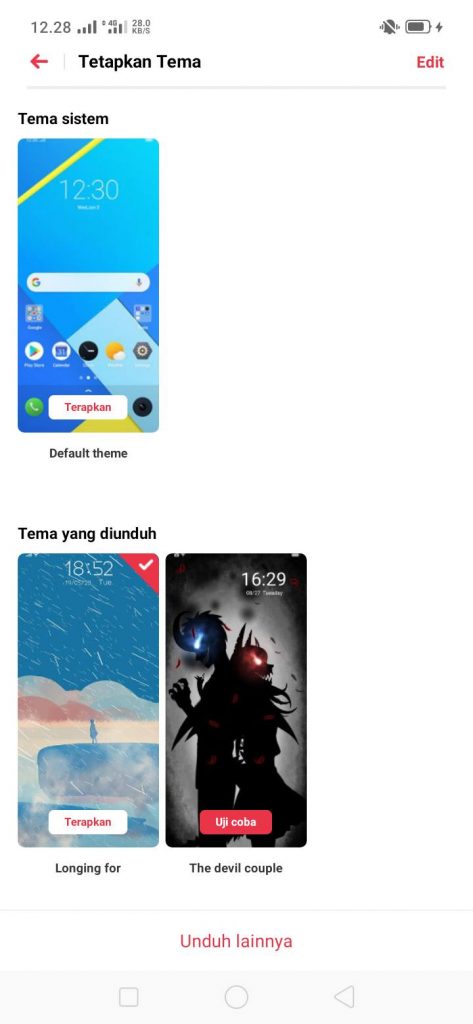 5. Pilihlah tampilan tema yang ingin diterapkan pada smartphone Realme kamu. Apabila pilihan tampilan tema yang kamu cari tidak ada, kamu bisa tekan Unduh lainnya untuk mencari tampilan tema yang kamu inginkan secara online. Kemudian, kamu terapkan tema yang telah kamu unduh (download).