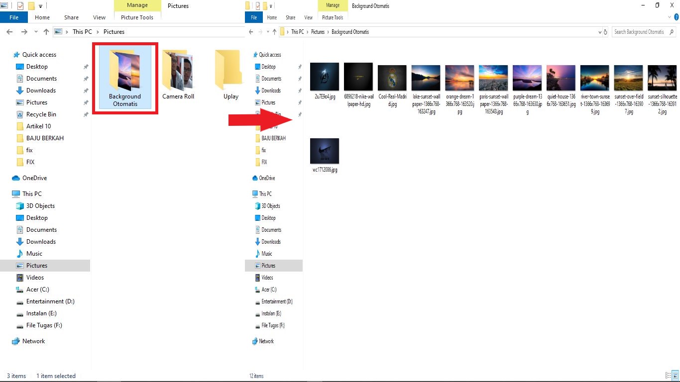 1. Buat folder khusus yang terdiri dari beberapa gambar yang ingin kamu pasang sebagai background otomatis. Disini penulis ingin memasukkan 12 gambar sekaligus untuk dipasang sebagai background.