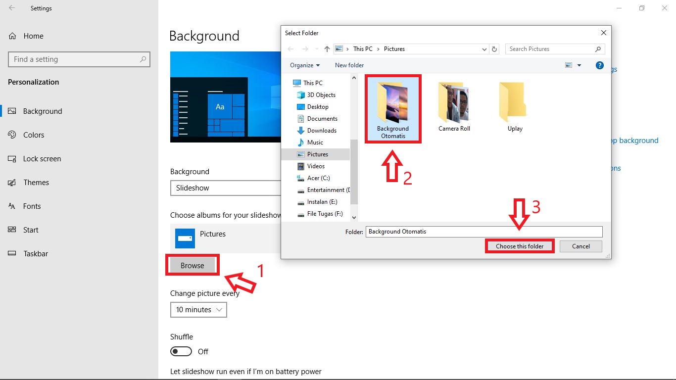 6. Teman-teman inwepo juga dapat mengatur periode waktunya setiap ganti background, disini penulis memilih 10 menit, yang berarti setiap 10 menit maka background akan berganti secara otomatis. Kamu juga dapat mengatur urutan tampil gambarnya mau urut atau acak.