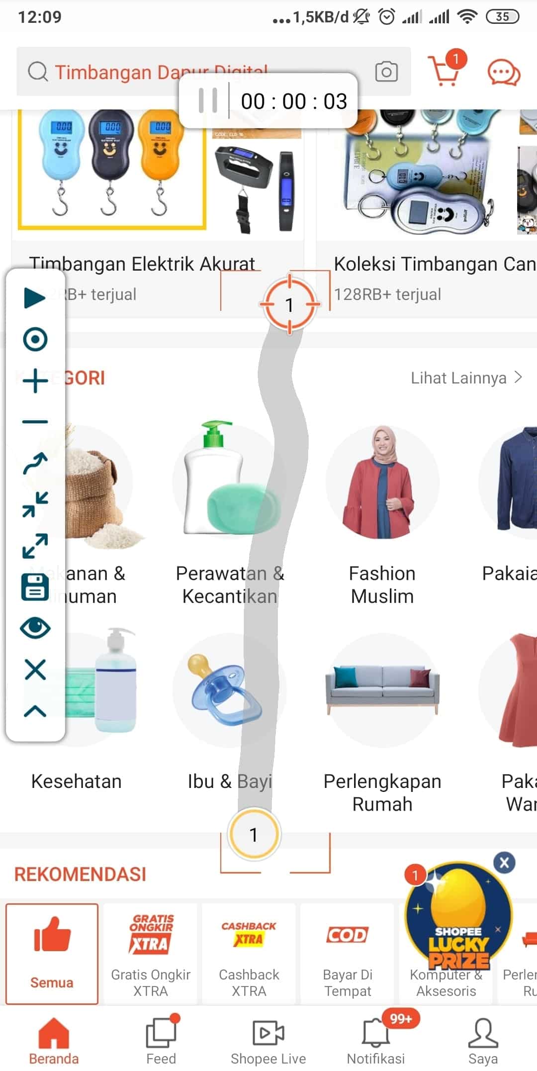 6. Lanjut kita ketuk tombol home pada handphone kita agar aplikasi ini tetap aktif, setelah itu kita menuju aplikasi yang ingin kita scroll otomatis, disini saya coba ke aplikasi shopee. Apabila kamu ingin melakukannya di aplikasi lain juga bisa, terutama aplikasi yang membutuhkan geseran layar yg cukup banyak seperti buku digital.
