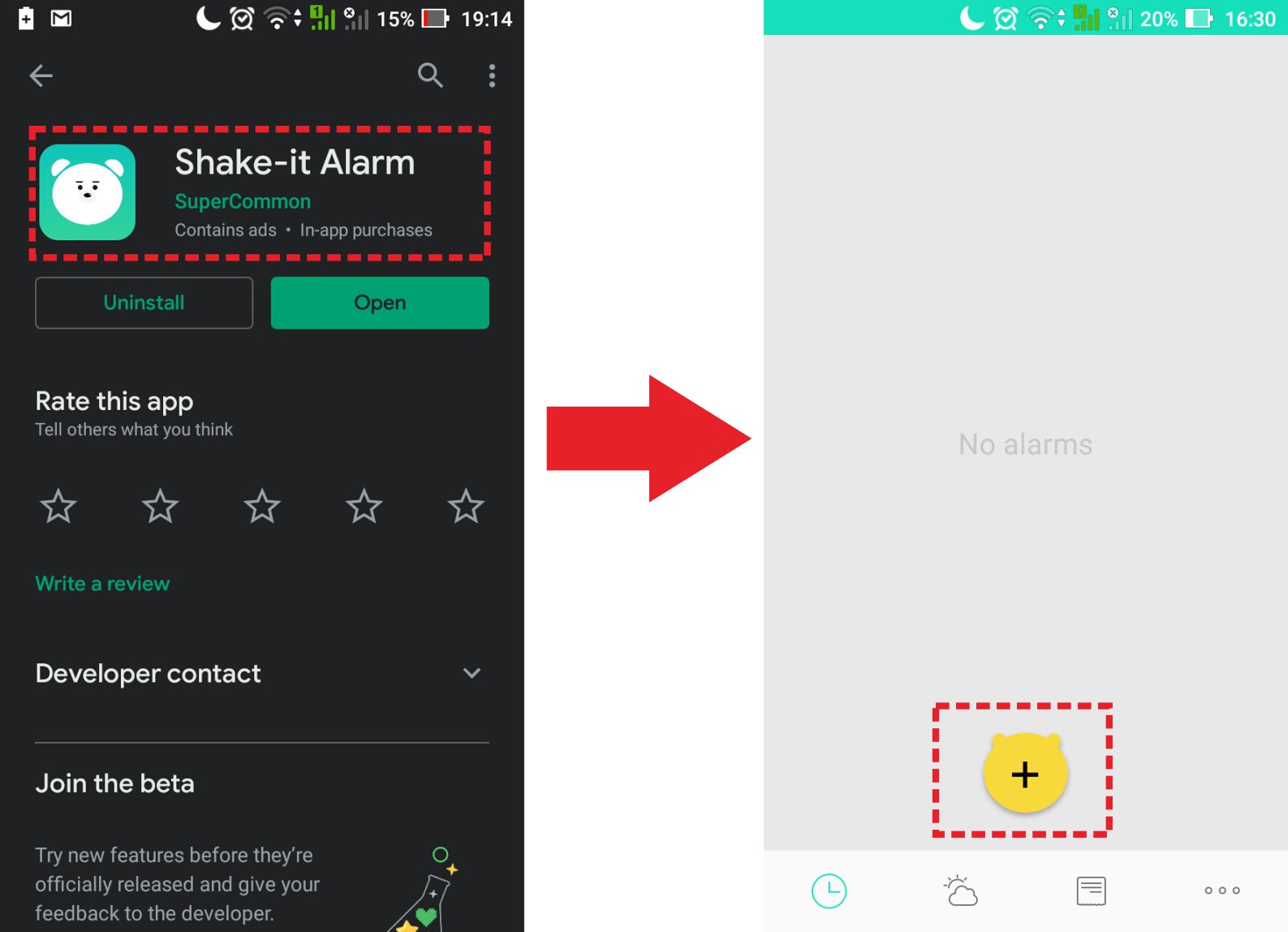 1. Terlebih dahulu, unduh aplikasi Shake-it Alarm di perangkat kamu melalui play store. Jika proses instalasi sudah selesai, klik buka. Kemudian pada menu awal aplikasi, pilih logo tanda “plus” untuk menambahkan pengaturan alarm.