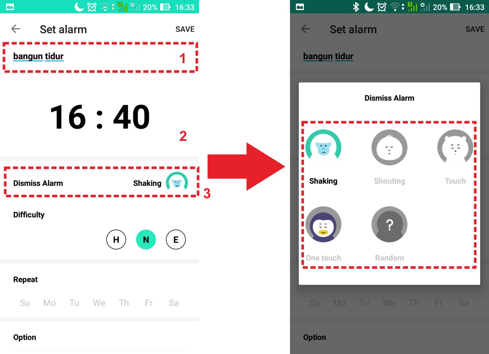2. Kamu akan masuk ke menu pengaturan. Pertama tentukan judul alarm yang dibuat. Kedua tentukan waktu alarm akan berbunyi. Ketiga tentukan juga mode penonaktifan alarm. Pada mode penonaktifan ini terdapat beberapa cara seperti shaking, shouting, touch hingga random dari ketiganya.