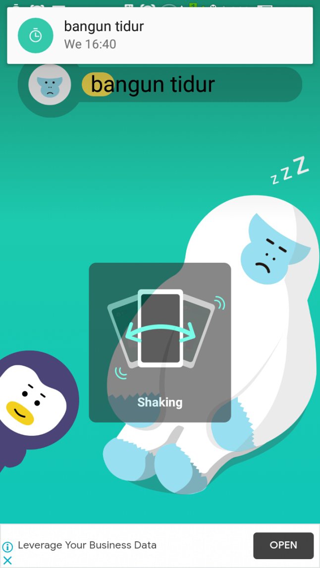 4. Adapun hasilnya, ketika alarm berbunyi maka akan muncul notifikasi seperti pada gambar. (Karena pada pengaturan alarm, penulis menggunakan mode shaking. Maka ketika akan mematikan alarm, penulis harus menggoyangkan smartphone agar alarm berhenti).