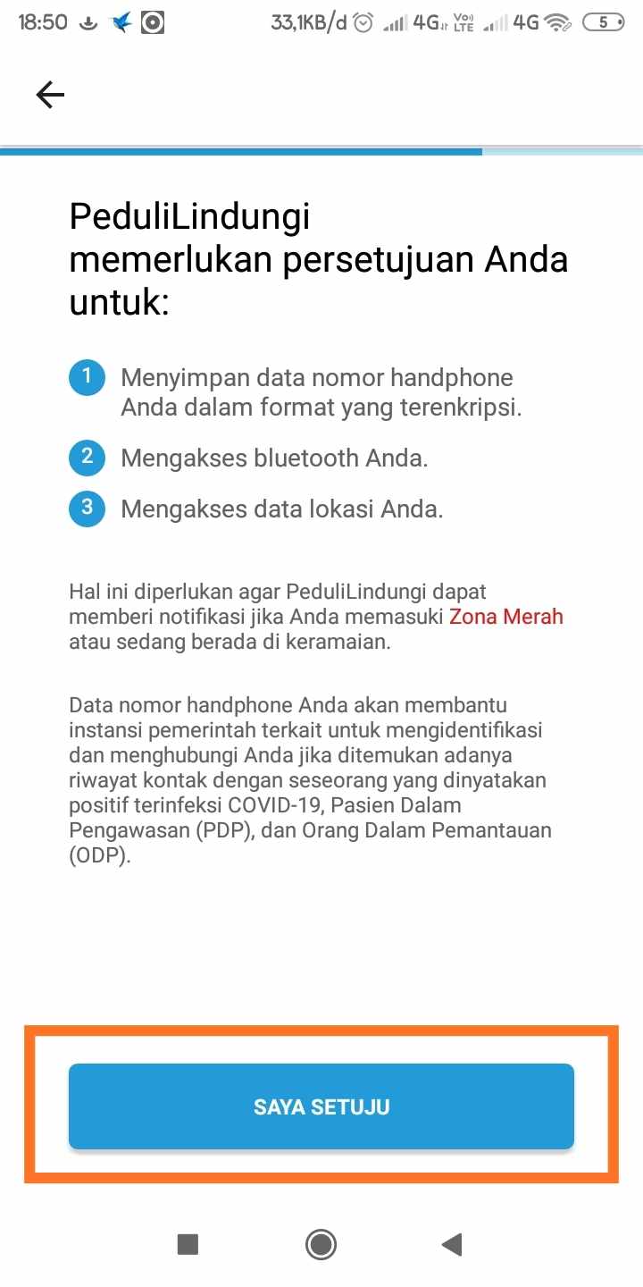 5. Selanjutnya Tap “Setuju” akan persyaratan aplikasi PeduliLindungi.