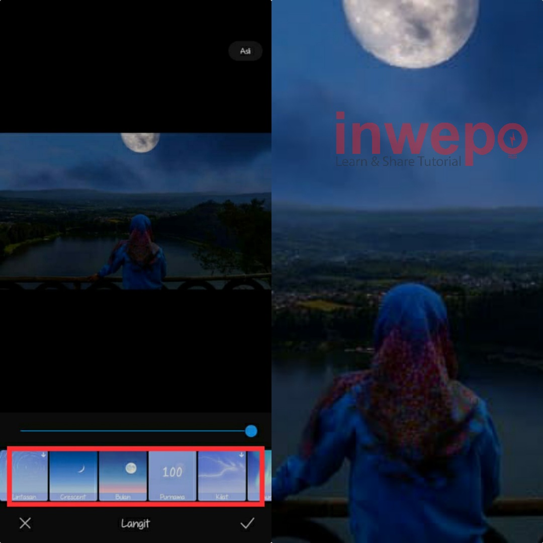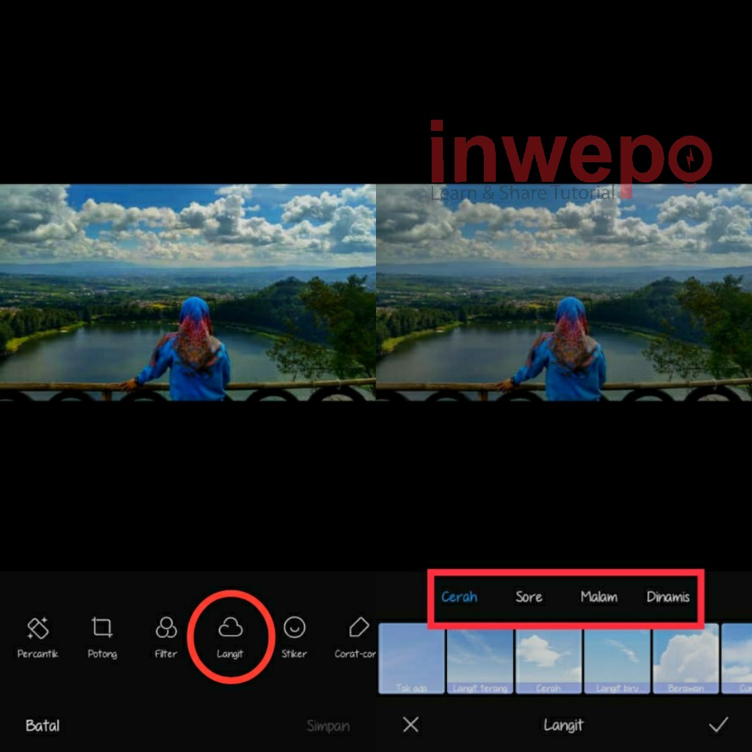 2. Terdapat banyak sekali menu yang muncul, pilih saja menu Langit. Akan muncul lagi beberapa pilihan, untuk yang ingin menggubah menjadi awan bergerak kamu tinggal pilih menu Dinamis.