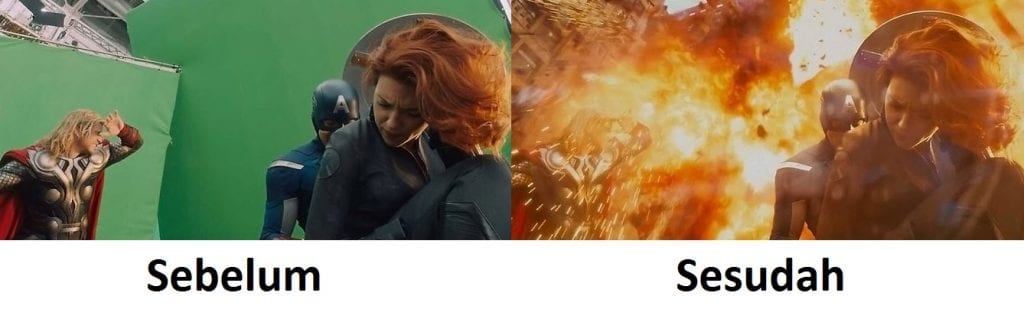 Efek green screen sering sekali digunakan pada industri perfilman hollywood, tak jarang juga Indonesia sering menggunakan efek green screen ini, dan asal kamu tahu, para editor pada industri perfilman seperti ini dibayar sangat mahal karena proses editing yang sangat susah, contohnya seperti pada gambar di bawah ini.