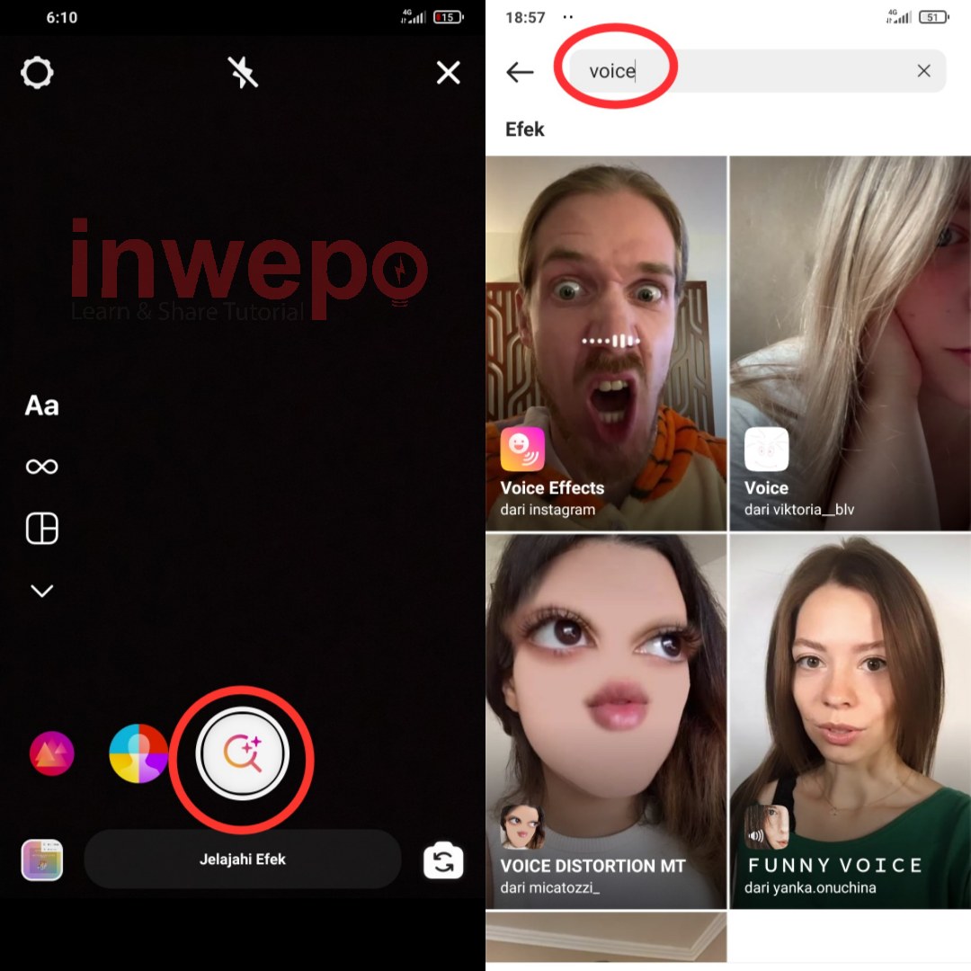 1. Seperti biasa buka aplikasi kamera instagram yang kamu miliki. Selanjutnya geser ke kanan hingga menemukan menu telusuri efek. Setelah masuk ke laman pencarian ketikkan “voice”.