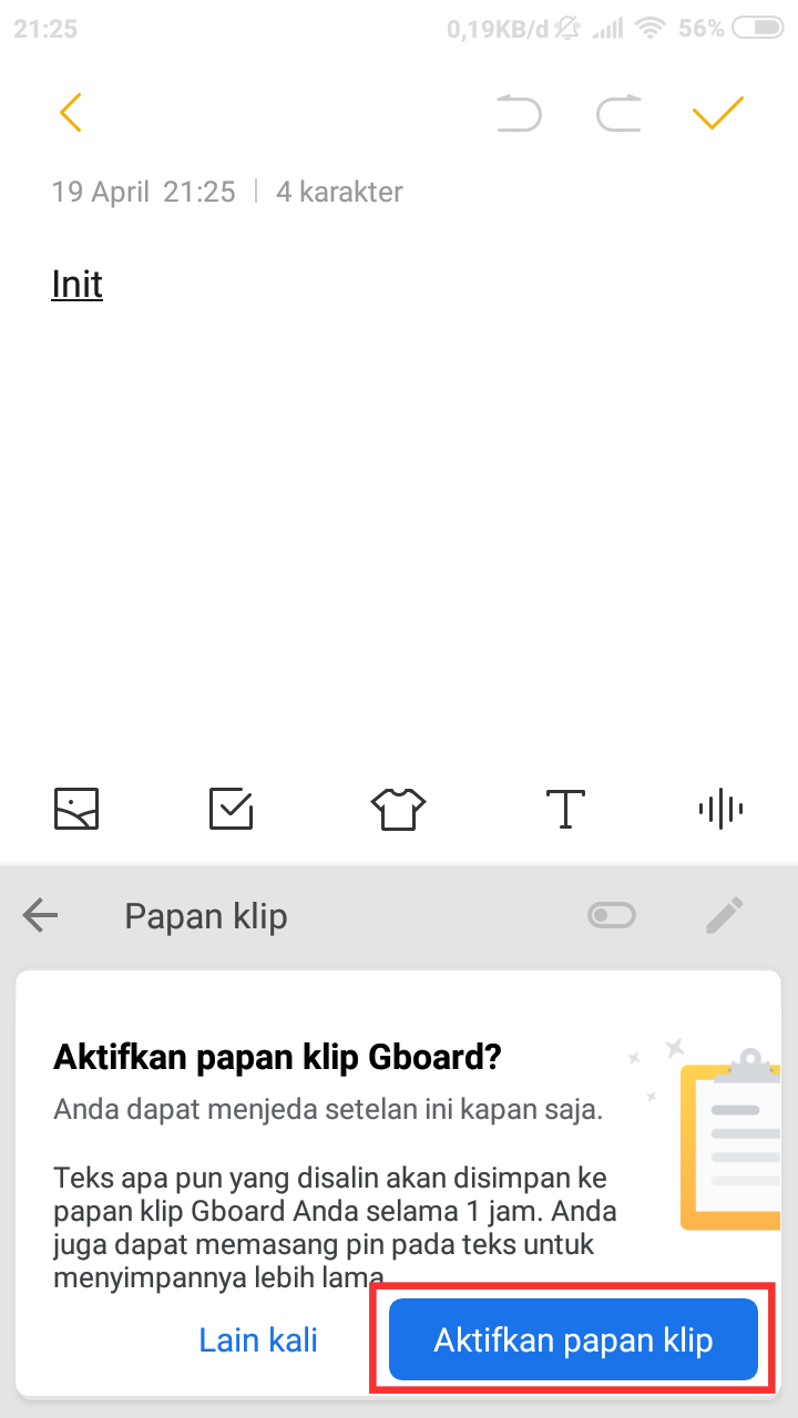 4. Pada saat clipboard baru dijalankan pertama kalinya, nantinya kita akan diberikan bentuk konfirmasi yang mengindikasikan penggunaan aplikasi clipboard. Pilih opsi Aktifkan Papan Klip untuk melanjutkan penggunaan fitur clipboard pada aplikasi terkait.